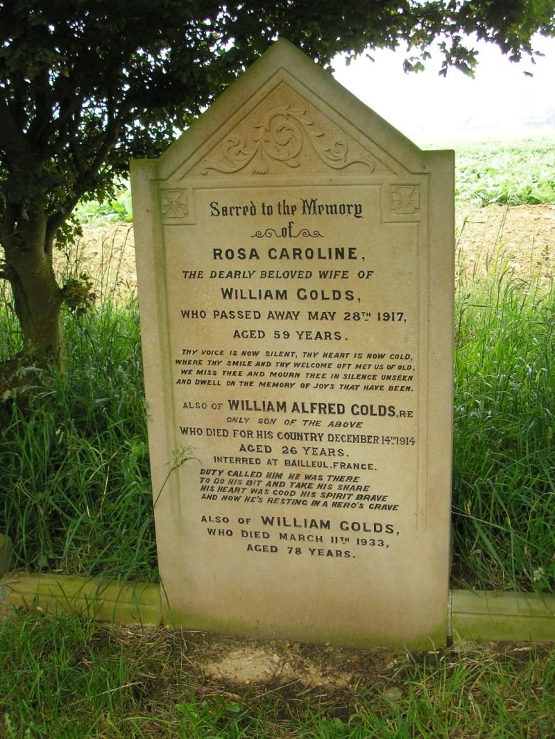1. ii William Alfred GOLDS, born Jun 1888 in Aldeburgh (Suffolk), census 1891 on HM Coastguard Vessel - moored at Steeple (Essex), census 1901 at Plough Inn, Hougham (Kent), died 14 Dec 1914 in Northern France - Aged 26, buried 1914 at Bailleul Communal Cemetery (Nord) - A.27, Service number 18256, Sapper - 9th Field Coy. - Royal Engineers.